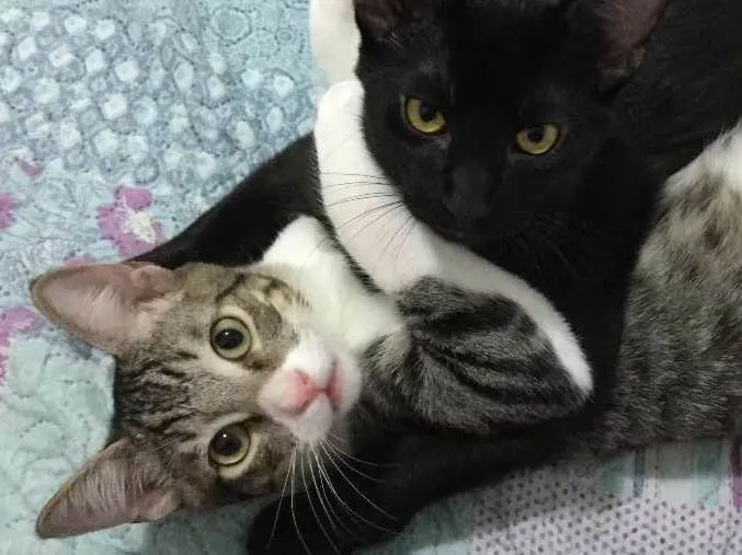 Oi tias e tios!! Estamos aqui agarradinhos pra mostrar pra vocês o quanto nós gostamos de estarmos juntos e por isso a tia que está cuidando da gente não quer nos separar... Estamos crescendo e deixando ela super preocupada pq ninguém se interessou por nós ainda... pq será!? Ela fala que a gente é tão fofinho... Temos um motorzinho 2.0 dentro de nós que quando ela nos agarra pra beijar faz um barulhão... ela diz que é uma delícia de escutar.... Ninguém aí tem um espaço em casa e no coração pra gente?? Prometemos acordar vcs com mordidinhas no nariz e ronronados no ouvido :D :D