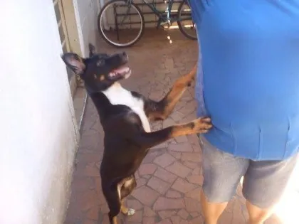 Cão preto de aproximadamente 5 meses precisa de um novo lar urgente. Adotado no centro, não se adaptou ao outro cachorro e está causando ciúmes.