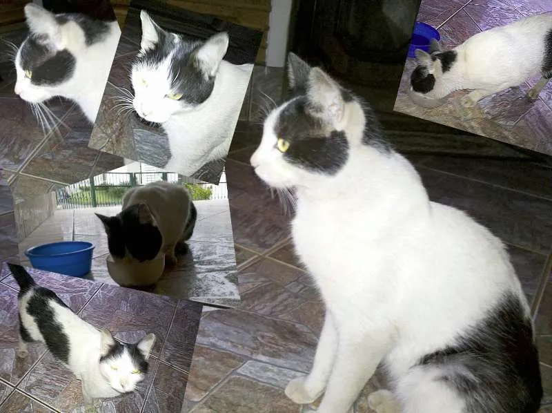 Ele é macho, branco e preto, tem uma marquinha preta no narizinho rosa, adulto com aproximadamente 4 anos e ainda não foi
