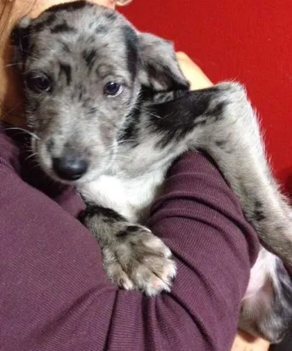 Sou uma vira-latinha nascida em 22/03/2015. A família que me adotou quis fazer um bem enorme para mim e para outra cachorrinha, então eles adotaram nós duas juntas. Mas infelizmente, não vão poder ficar com nós duas, porque eu sou muito grande, e como todos os filhotes, gosto de brincar de morder, mas estou machucando minha amiguinha, que é muito pequena e pesa pouco mais de 1kg, enquanto eu tenho 4,5kg. Segundo o veterinário, vou me tornar uma meninona! Inclusive, quando fui ao veterinário, todos ficaram encantados por mim, porque pareço uma vaquinha! Sou cinza com manchinhas pretas, minha cor é definida como arlequim.