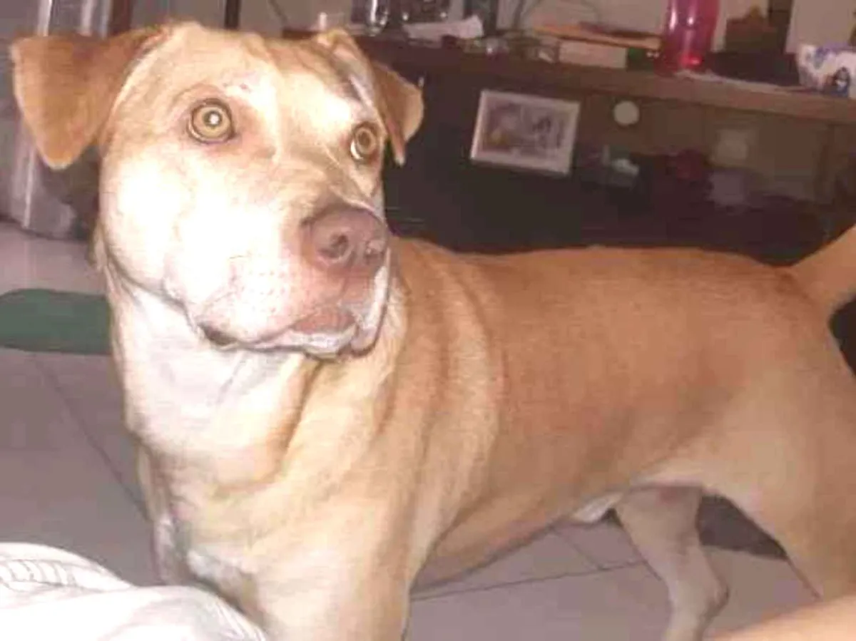 É um cachorro de grande porte, em torno de 1 ano, lindo, mistura de Pit Bull, super dócil, carinhoso e brincalhão.