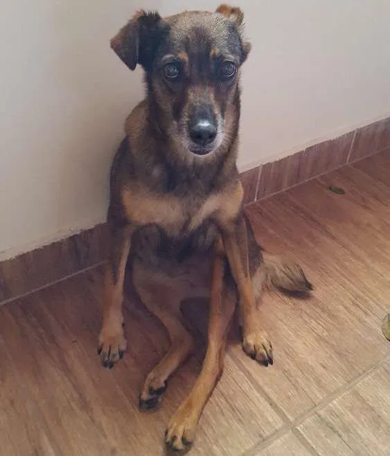 Adote a Doce, uma cadela vira-lata encontrada na Vila Assunção, Santo André! Com pelagem curta em marrom e preto, ela é muito dócil e merece um lar amoroso.