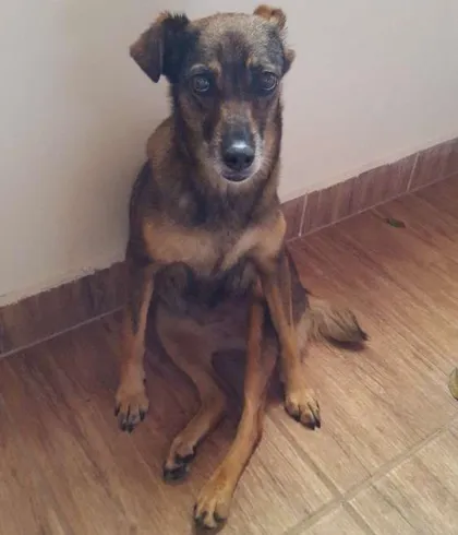 Pelagem curta marrom com preto... vira lata... muito dócil
