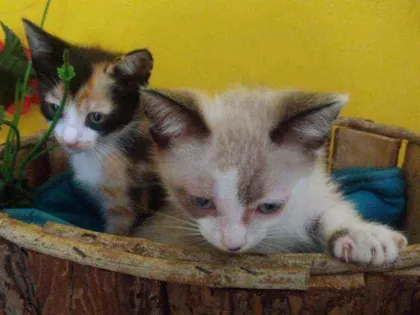 Adoção conjunta - tricolor fêmea, clarinho macho, são irmãos inseparáveis.