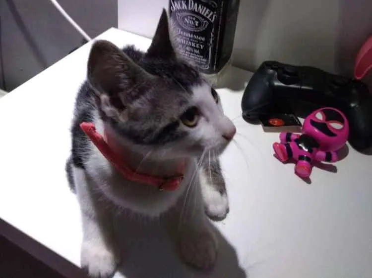 Possui pelos de branca com cinza e olhos cor de mel.