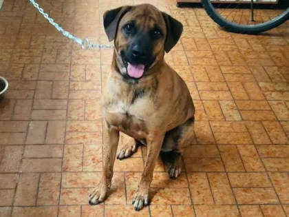 Nas fotos ele está acorrentado, mas é apenas para a tutora lavar o cantinho que ele fica.