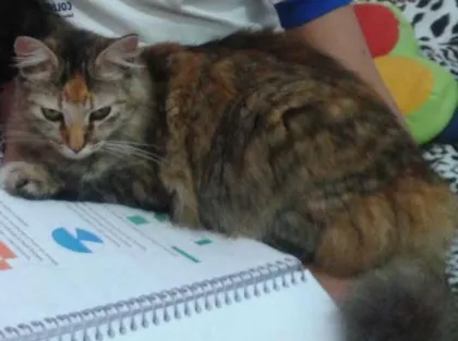 Ela é toda peluda, mas mansinha e medrosa, está com uma coleira rosa com guiso, tinha meu telefone escrito em caneta.