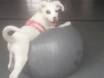 Albina srd mistura de labradora com cachorro de médio porte. Vacinada, vermifugada, dócil... brincalhona e adora pessoas. Come ração mas adora salada e frutas.