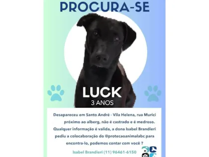 Cachorro porte grande, preto, com manchinhas brancas na pata traseira direita e manchinha branca no peito.