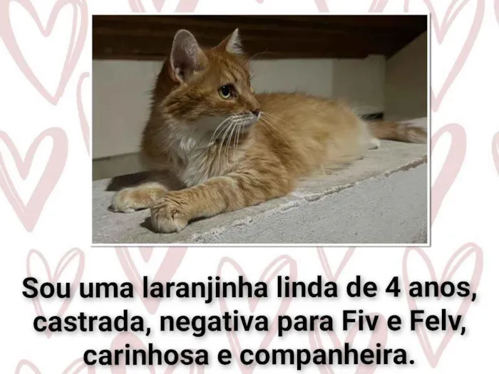 É tranquila, carinhosa e companheira, está castrada, vermifugada, negativa para Fiv e Felv.
