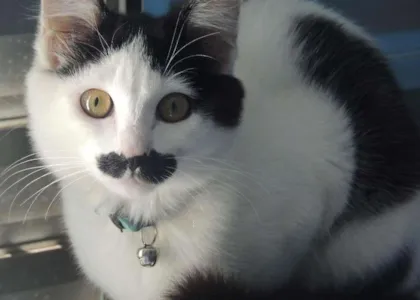 Adote a encantadora gata Donna, uma fêmea de 7 a 11 meses, preta e branca, com um charmoso "bigode" no focinho. Ela pode estar perdida, mas pode ser sua nova amiga!