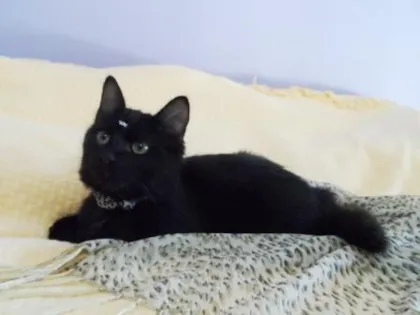 Gatinha de 4 meses procura um lar amoroso e seguro. A Lolita é pretinha, tem pelos de comprimento médio, está castrada, vacinada e vermifugada. Extremamente dócil com pessoas e outros gatos.