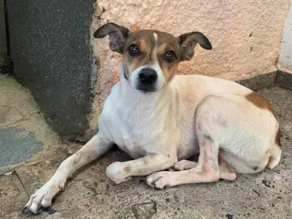 Toquinho, cadelinha SRD desaparecida desde 20/12/2024. Pequena, pelagem branca com manchas castanhas, doce e brincalhona. Ajude a encontrá-la!
