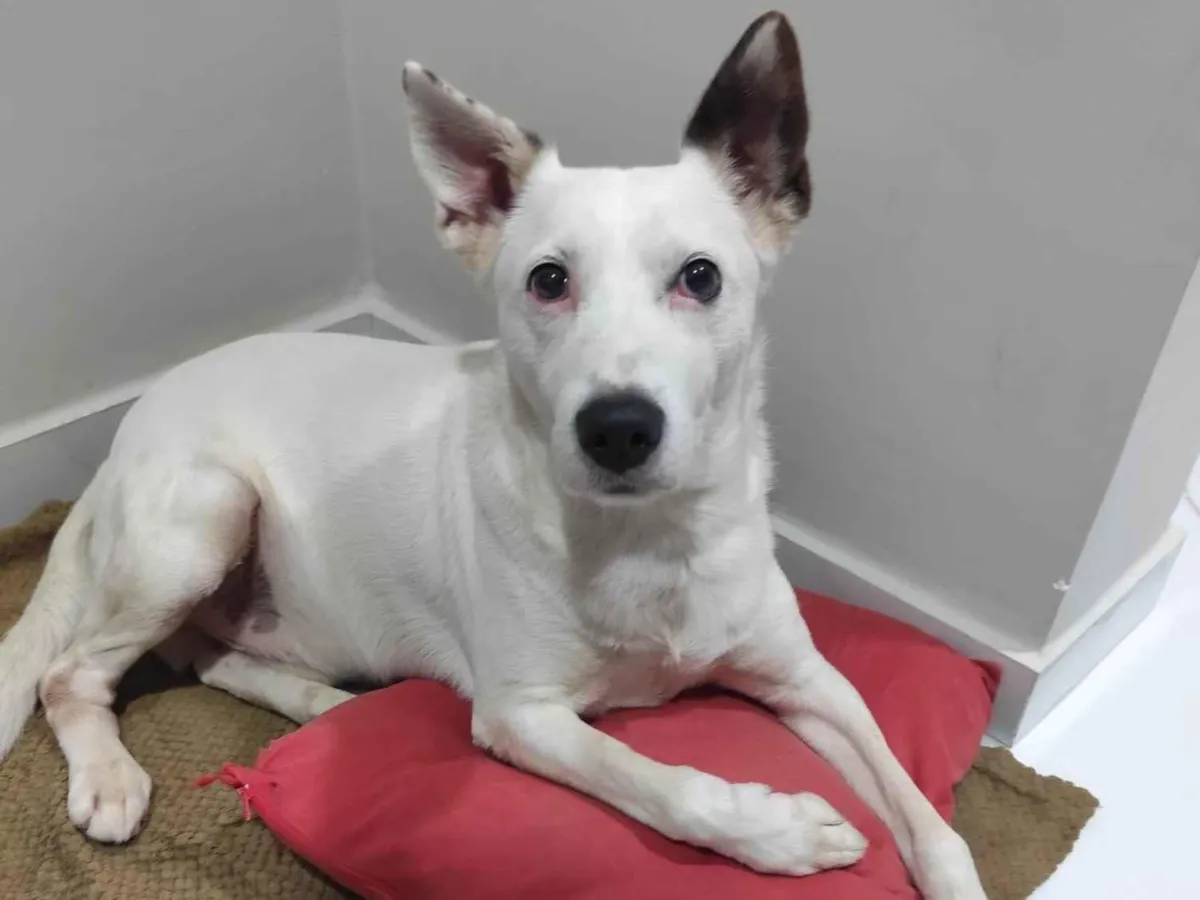 Adote Barão, SRD de 6 anos, pelagem branca. Cão leal, independente e sociável busca novo lar com espaço para brincar e amor para dar.