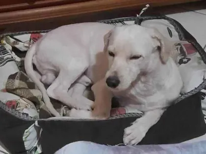 Adote Bidu, um cão macho de 2 anos, SRD, pelagem branca e porte médio. Ele é carinhoso, brincalhão e ideal para famílias com crianças. Venha conhecê-lo!