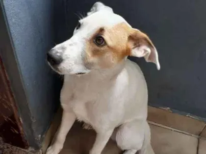 Adote Bolt, o doce cachorro de 8 meses! Com pelagem branca e mancha caramelo, ele é carinhoso e está em SP esperando por um lar. Venha conhecê-lo!