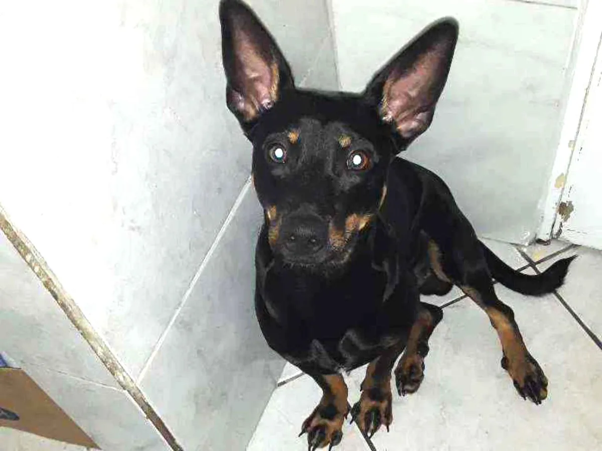 Adote Charlie, um adorável SRD de 7 meses! Preto com patas marrons e manchas perto dos olhos, ele é dócil e bem cuidado. Dê-lhe um lar em SP!
