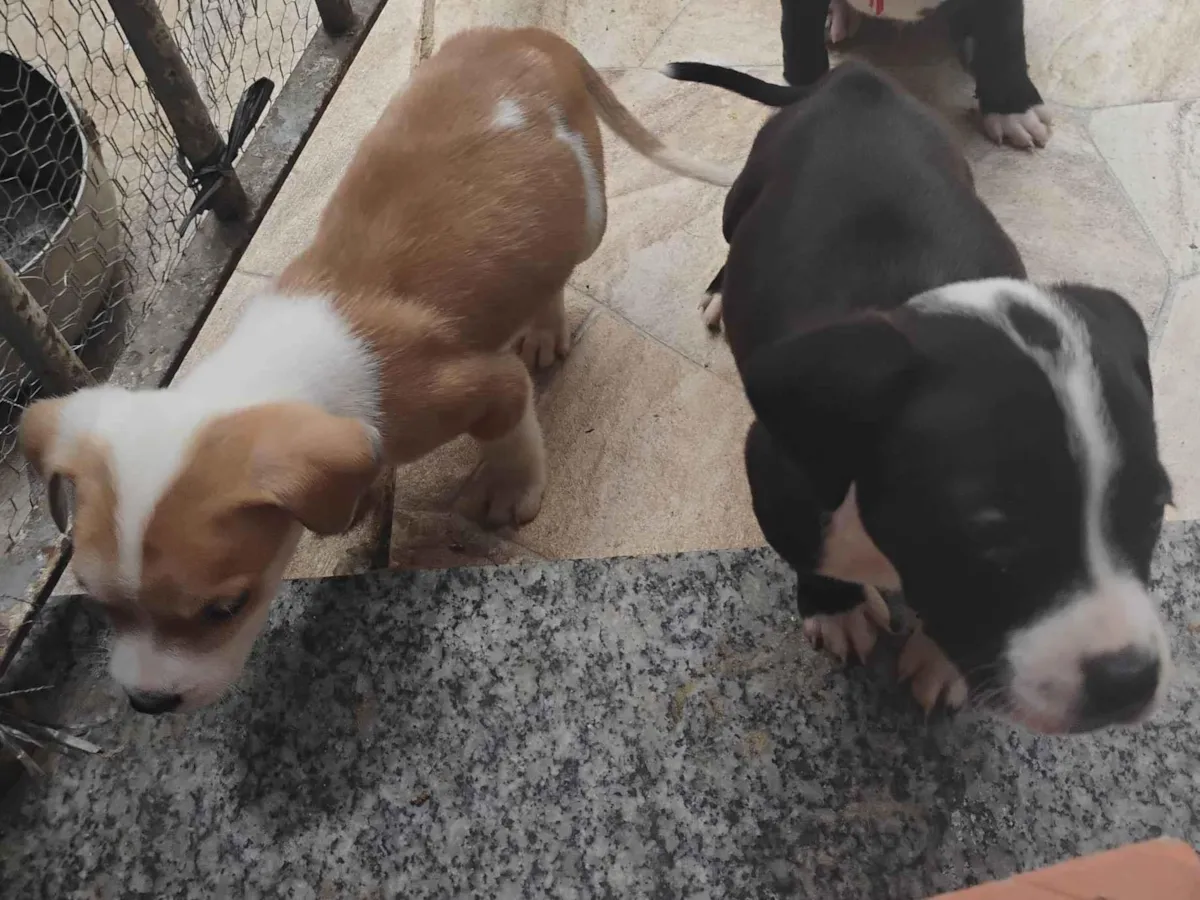 Filhotes de Pit-Bull com 2 meses para adoção. Dóceis e necessitando de cuidados especiais. Procure um novo lar com quintal. Venha conhecer!