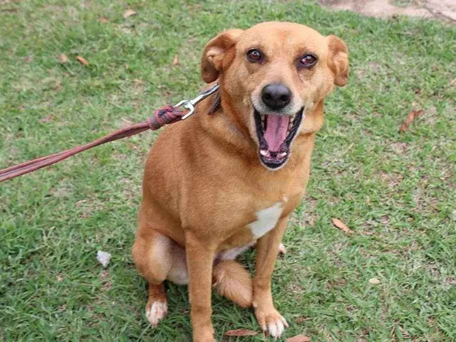 Magnólia é o tradicional vira-lata caramelo mais amado do Brasil! História: Foi resgatada quase sendo atropelada no meio da rua. Tem uma glândula no olho que já