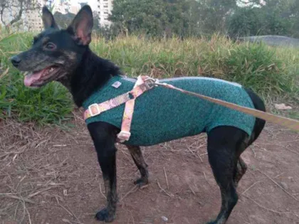 Conheça a Menina, uma adorável cadela preta de 2 anos que se dá bem com outros animais. Ela está pronta para encontrar um novo lar em São Paulo/SP.
