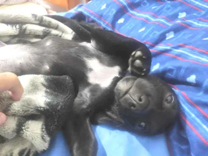 Filhote preto com detalhe branco no peito, carinhoso, brincalhão e sociável. Já recebeu a primeira vacina V10 e está pronto para as próximas doses.