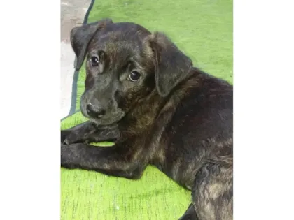 Cachorrinha SRD-ViraLata de pelagem rajada, 2 a 6 meses, dócil, calmo e sociável, busca um lar amoroso. Adaptável em casa ou apartamento, pronta para ser adotada.