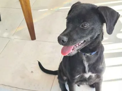 Peninha, filhote preto de porte médio, está pronto para adoção. Aprendeu a fazer xixi no tapetinho. Incluo vacinas e castração no primeiro ano.