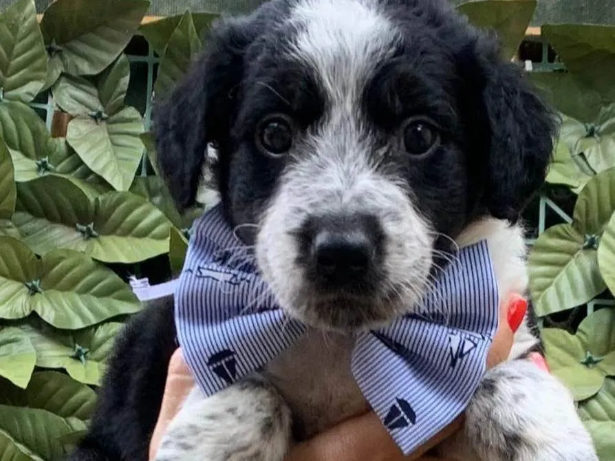 Adote Raffaelo, filhotinho SRD de 50 dias, pelagem branca e preta, dócil e sociável. Vacinado e pronto para ser seu fiel companheiro. Conheça-o!