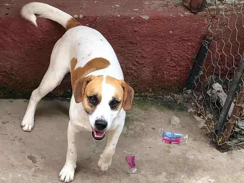 Cachorro branco com manchas preta e marrom, dócil e inteligente, busca novo lar. Menos de 2 anos, hiperativo e brincalhão. Localização: Penha - SP.