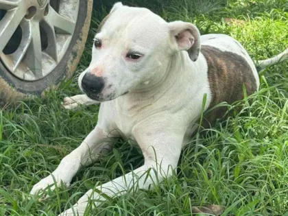 Adote o adorável Theo, um pitbull resgatado de maus-tratos. Dócil e brincalhão, procura um lar amoroso. Experiência com a raça necessária para a adoção.