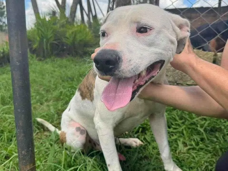 Adote Theo, um pitbull resgatado, dócil e brincalhão. Procura um lar amoroso com quem tem experiência na raça. Faça a diferença na vida dele!