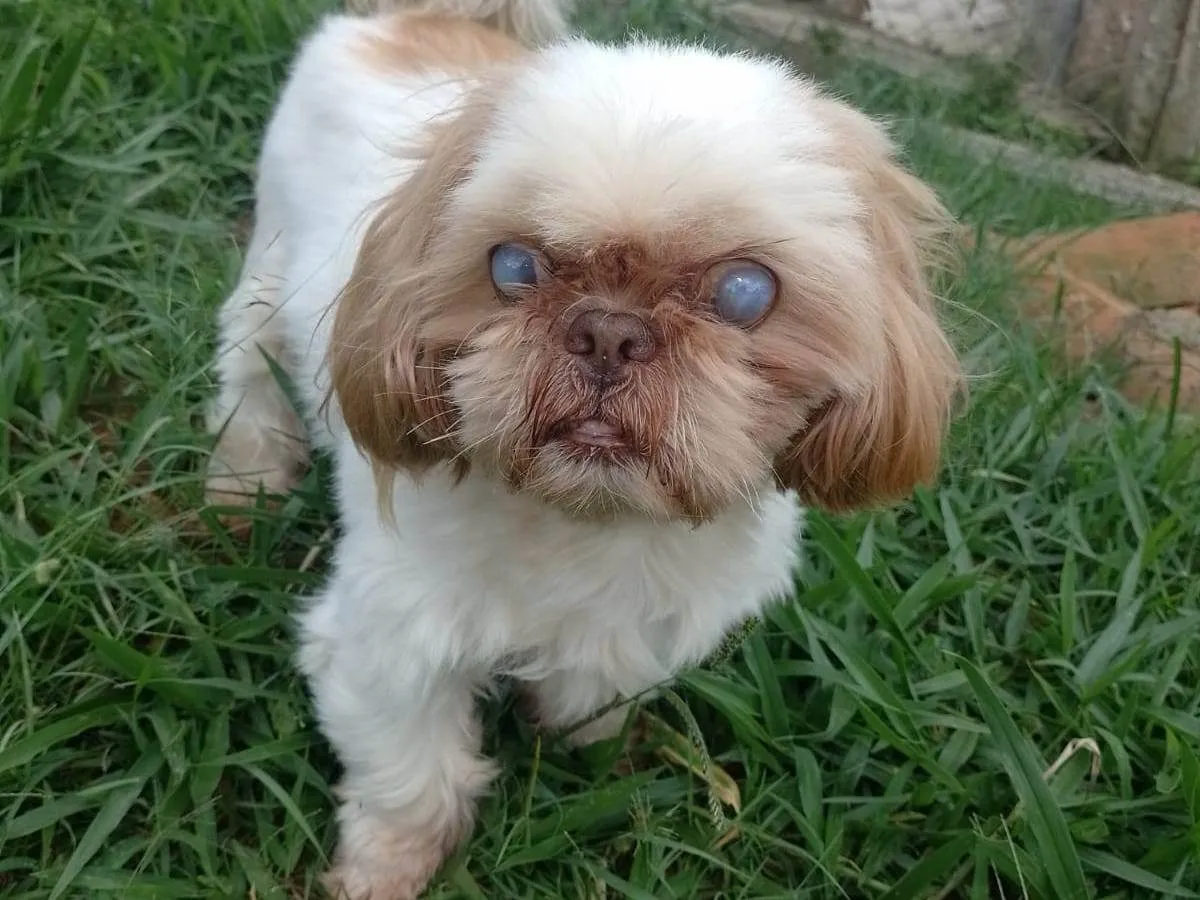 Adote Toddy, um Shih Tzu macho de 2 anos com deficiência visual, carente de amor e atenção. Ofereça um lar temporário ou especial para ele.