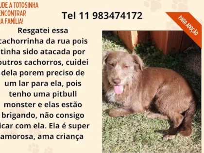 Cachorra dócil resgatada de ataque por outros cães, mas não aceita conviver com minha pitbull. Preciso de ajuda para encontrar um novo lar para ela.