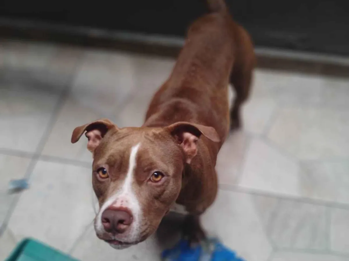 Adote a Tulipa, uma Pit-Bull de 2 anos, sociável e brincalhona. Ideal para famílias com quintal, ela traz alegria e amor. Conheça-a!