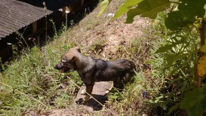Idêntica a um pastor, mas sem raça definida. Ainda filhote, mas não deve crescer muito, mansa, mas assustada. Esta no tempo numa área do prédio, no relento, no