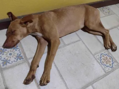 Cachorra encontrada em Imbassai, Bahia. Olhos verdes, pelo curto cor de mel com peito branco. É dócil, gosta de crianças e pode estar perdida ou abandonada.