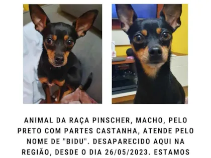 Ajude a encontrar o Bidu, um Pinscher macho de 2 anos desaparecido em São Paulo. Oferecemos recompensa. Estamos desesperados por notícias!