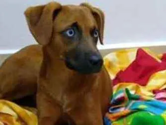 Adote Céu, uma fêmea caramelo de 2 a 6 meses com lindos olhos azuis. Ela está perdida em São Paulo/SP e precisa de um lar cheio de amor.