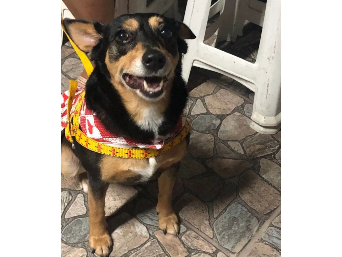 Pelagem preta; traços marrom/caramelo face, dorso, patas; rabo curto (parece cortado); bolinhas de gordura na barriga; castrada;