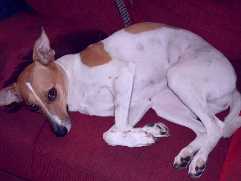 Adote July, uma linda cadela SRD de 4 anos, branca com manchas caramelo. Ela é doce e estava perdida em São Paulo. Dê uma chance a ela!