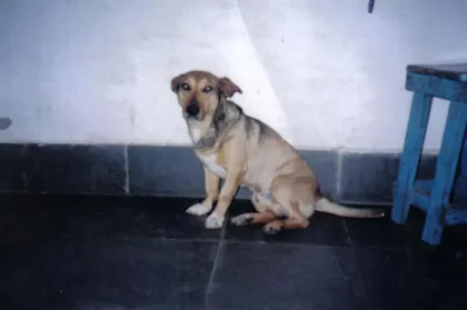 Peter 14 anos - marrom e prerto com as patas brancas, tem os olhos bem claros (catarata)