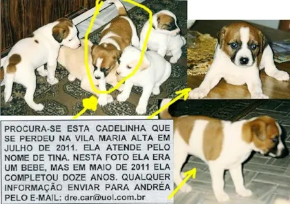 Tina, uma fêmea castrada com pelagem branca e caramelo escuro, está desaparecida desde 2011. Ajude a encontrá-la e traga-a de volta para casa.