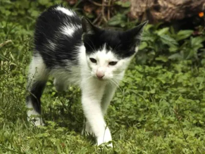 Adote Gatito Chinês, um encantador gato SRD de pelagem branca e preta, com 2 a 6 meses. Dócil, brincalhão e sociável, ele é o companheiro ideal.