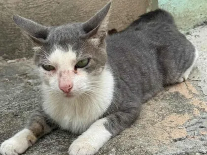 Cachorro castrado e super amigável encontrado na rua. Ele tem um machucado cicatrizado e problemas oculares, está junto com uma gatinha branca.