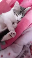 Docinho é uma gatinha branca com tigrado, dócil e carinhosa. Castrada e vermifugada, procura lar seguro e telado, sem rotas de fuga.