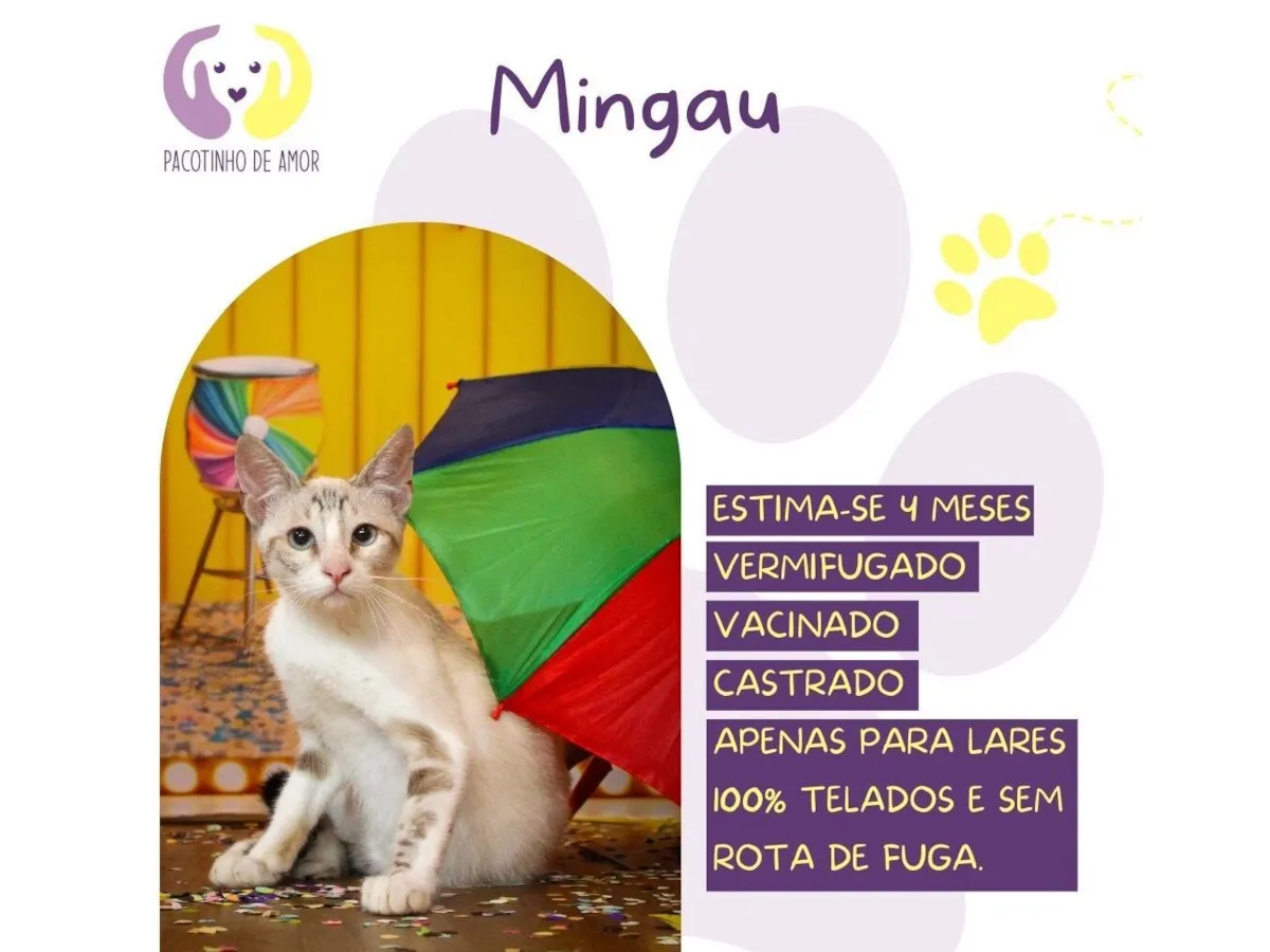 Adote Mingau, um adorável gato SRD! Siga os critérios de adoção responsável e ajude a dar um lar a um amigo peludo. Junte-se ao nosso projeto voluntário hoje!