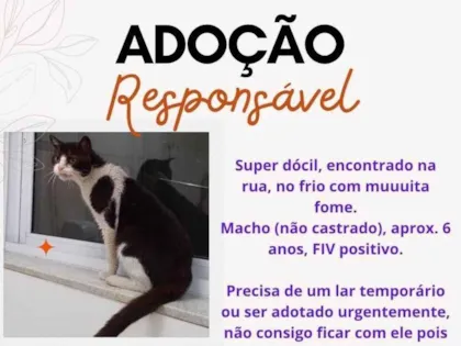 Adote um gato SRD de 6 anos, carente e dócil. FIV positivo, precisa de cuidados especiais. Dê amor a quem precisou de ajuda nas ruas.