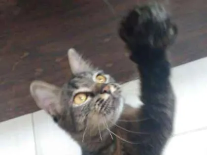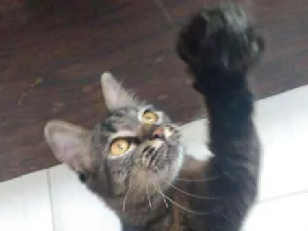Gatinha rajada resgatada de maus tratos está pronta para adoção. Castrada, vacinada e vermifugada. Ideal para casa ou apartamento telado.