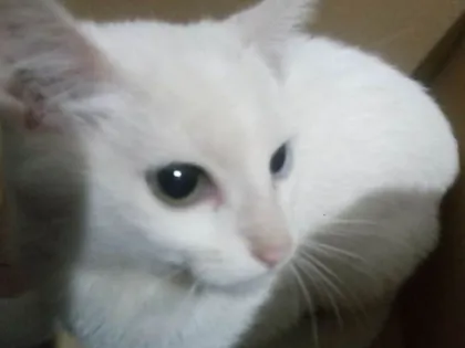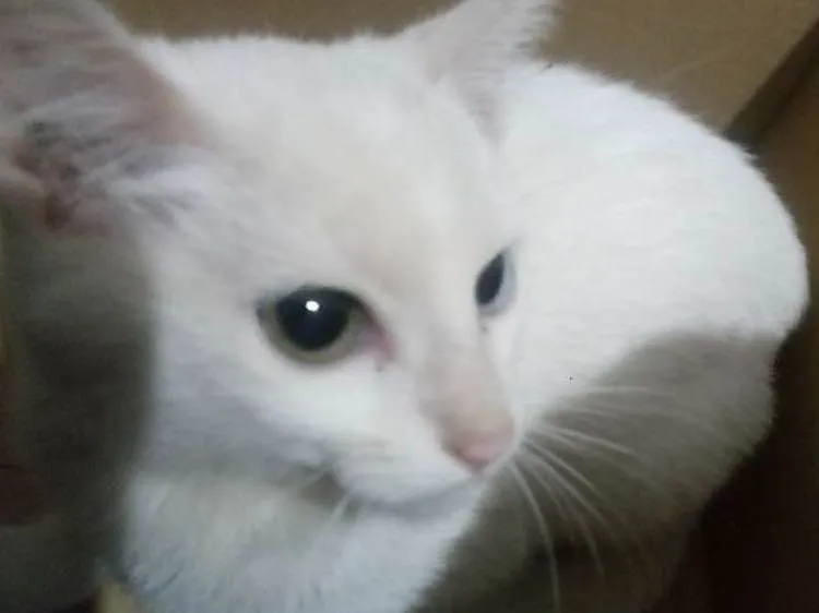 Ele é filhote, macho, tem um olho verde e um azul, muito dengoso.