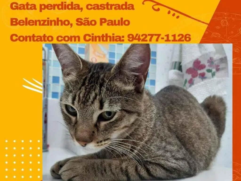Gata castrada, idade estimada de 3 anos, encontrada no bairro do Belenzinho, São Paulo, em outubro de 2021. Vermifugada e vacinas iniciadas. Somente para lares